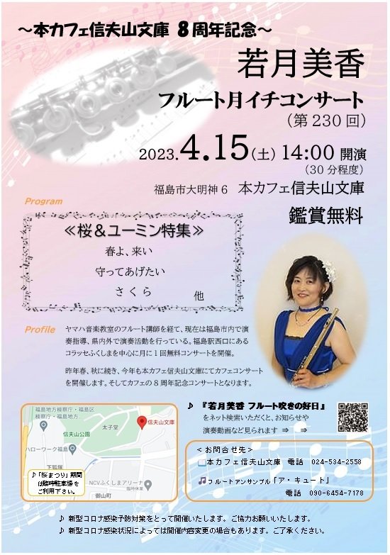| お問い合わせ | フルートアンサンブル ア・キュート主催 mail:mikawaka@ymail.ne.jp Messenger:@wakam1ka Instagram:m1ka_2k1waka ℡:090-6454-7178 本カフェ信夫山文庫 ℡:024-534-2558 |