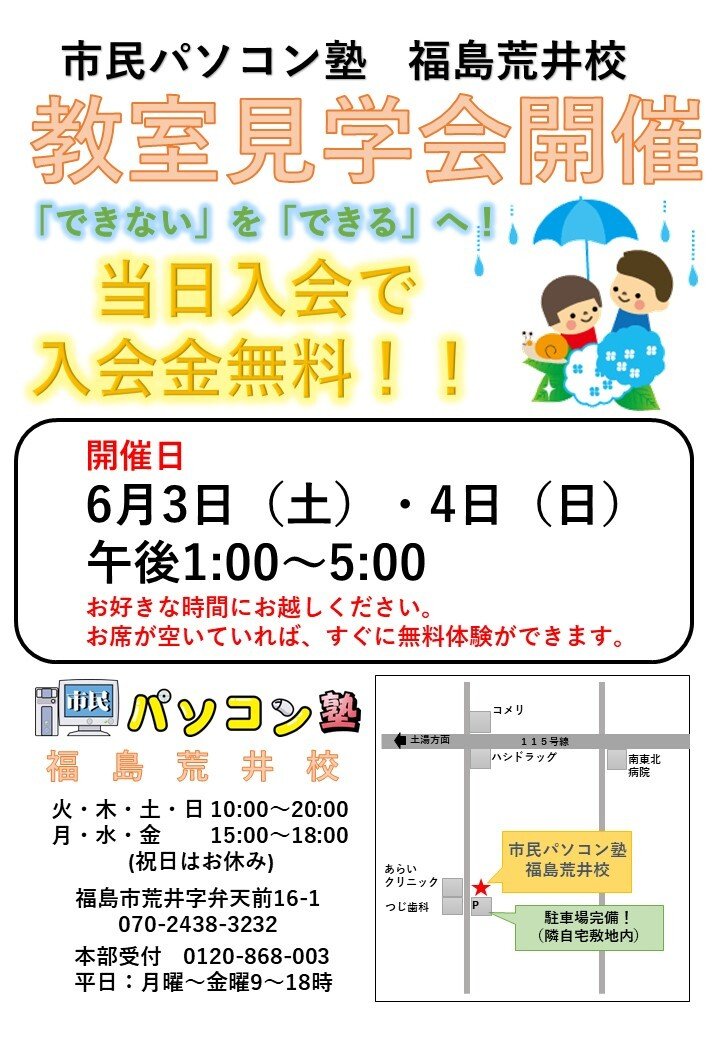 | お問い合わせ | 市民パソコン塾 福島荒井校 ☏070-2438-3232 |