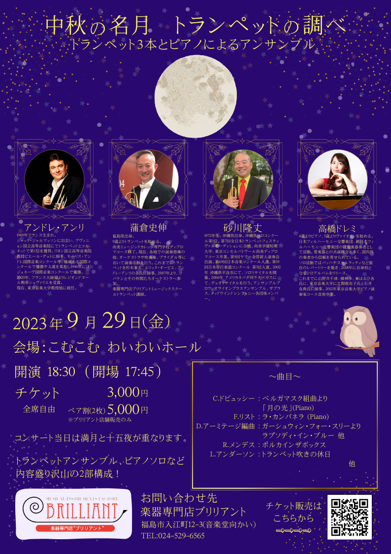 | お問い合わせ | 主催:十五夜のトランペットの調べ実行委員会 お問い合わせ先:楽器専門店ブリリアント TEL 024-529-06565 |