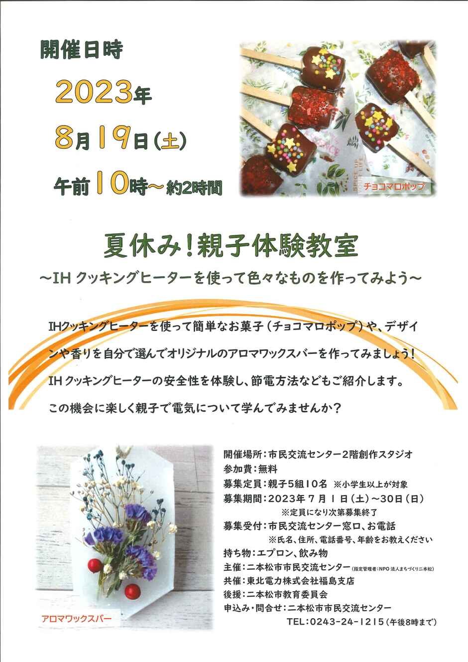 | お問い合わせ | 【主催】 二本松市市民交流センター(NPO法人まちづくり二本松) TEL:0243-24-1215 【共催】 東北電力株式会社 福島支店 |