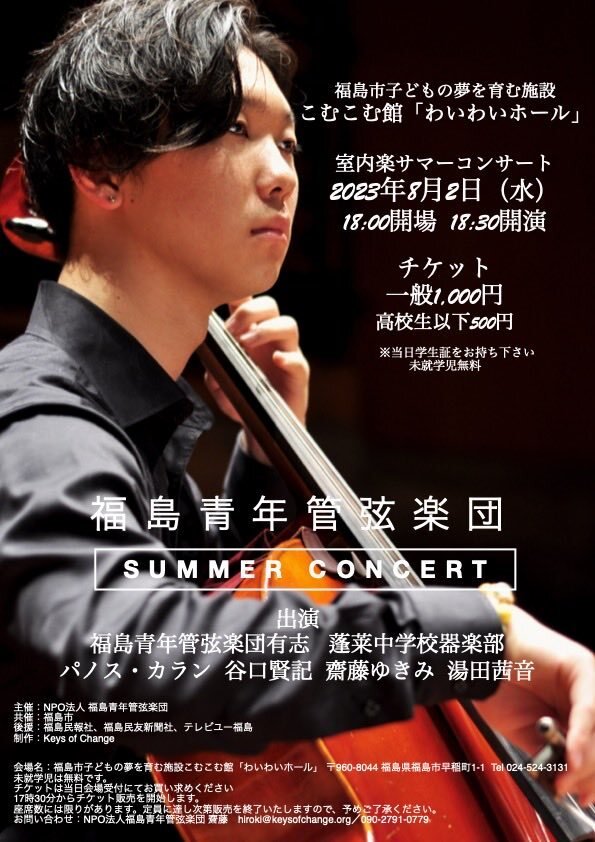 | お問い合わせ | NPO法人福島青年管弦楽団 E-mail:hiroki@keysofchange.org Tel:090-2791-0779(齋藤) |