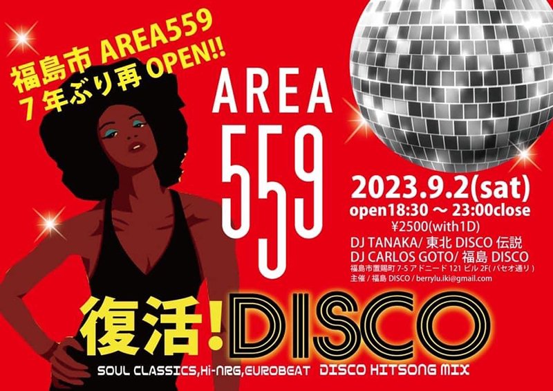 | お問い合わせ | AREA559 福島市置賜町7-5 アドニード121ビル2F 主催/福島DISCO |