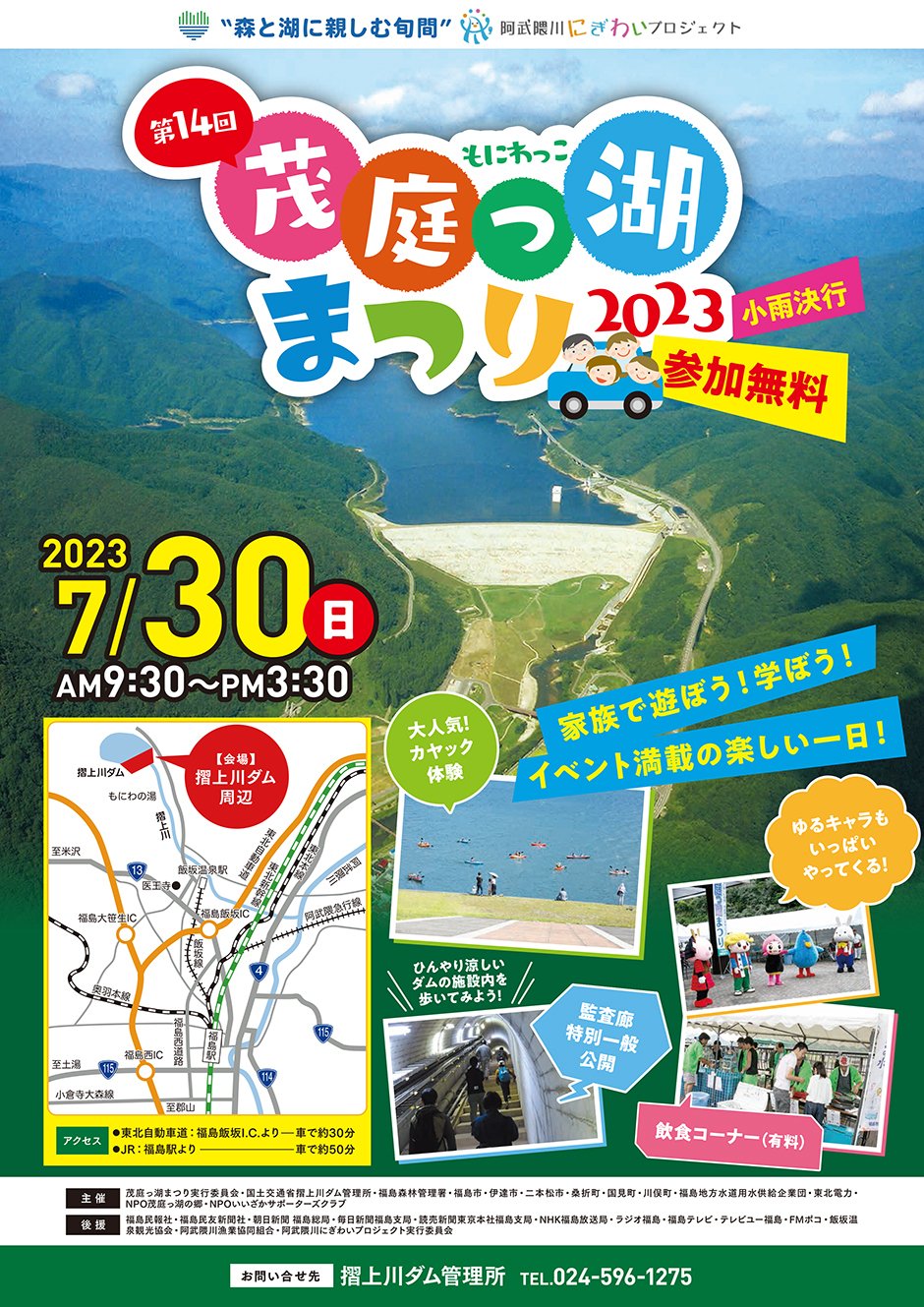 | お問い合わせ | お問い合わせ先 茂庭っ湖まつり実行委員会 摺上川ダム管理所 〒960-0271 福島県福島市飯坂町茂庭蝉狩野山25 電話024-596-1275 |