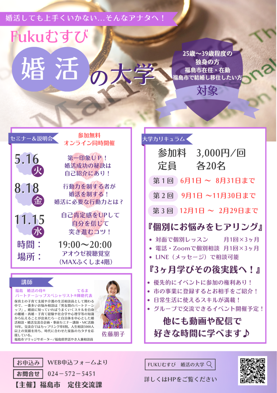 福島市に移住予定や福島市にご縁があればと思う独身の方でしたら全国から参加可能です。