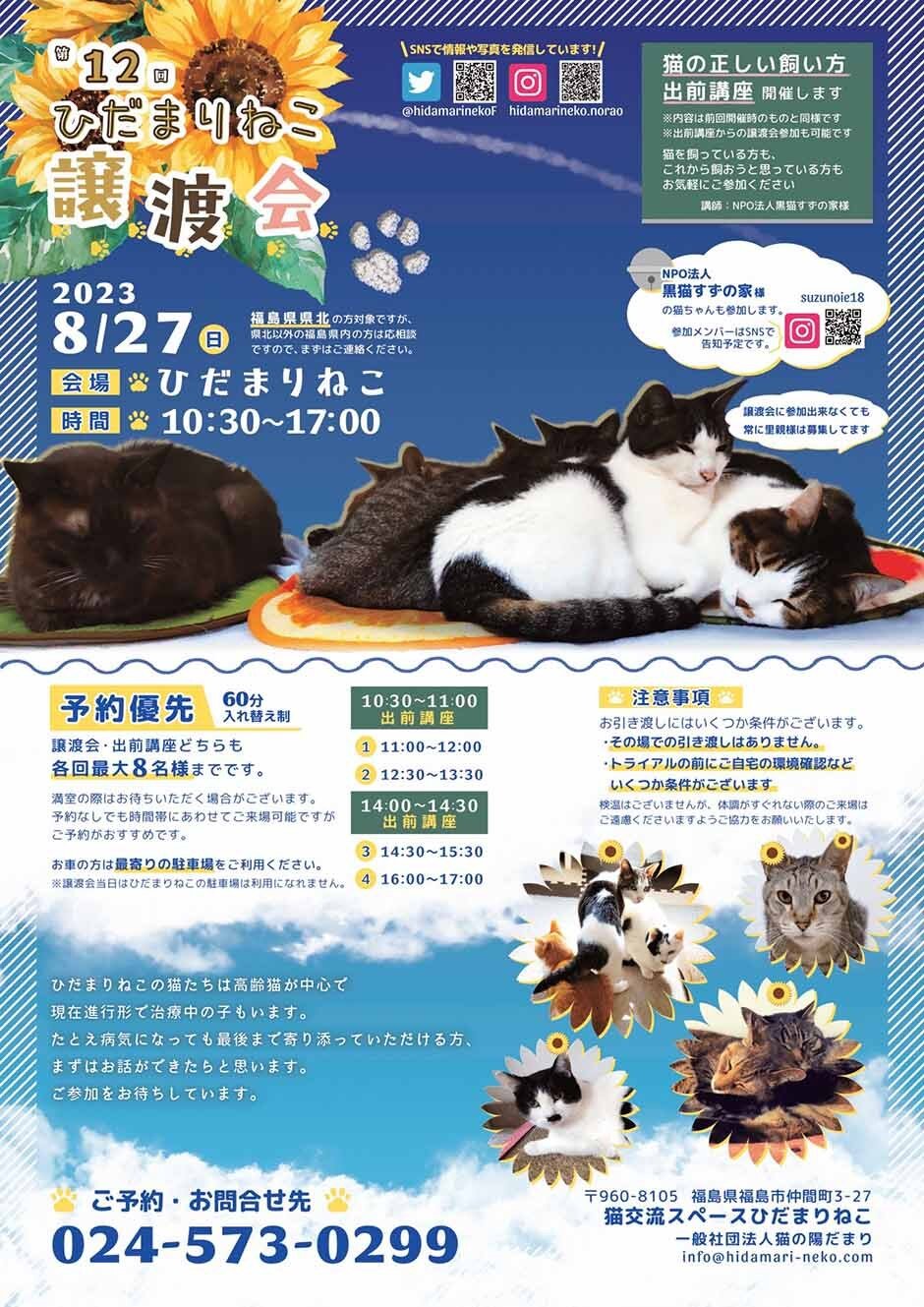 | お問い合わせ | ■お問い合わせ先 一般社団法人猫の陽だまり 〒960-8105 福島県福島市仲間町3-27 TEL 024-573-0299 メール info@hidamari-neko.com |