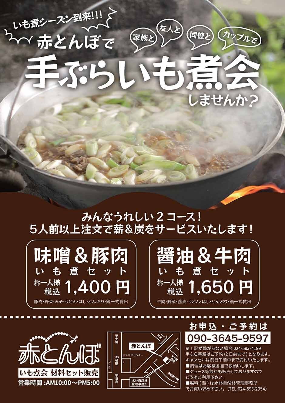 | 参加費 | 味噌&豚肉芋煮セット お一人様1,400円/醤油&牛肉芋煮セット お一人様1,650円 |