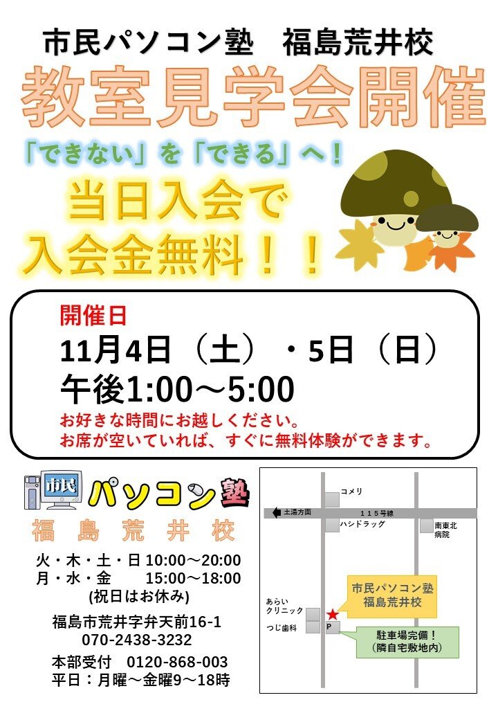 | お問い合わせ | 市民パソコン塾 福島荒井校 電話070-2438-3232 |