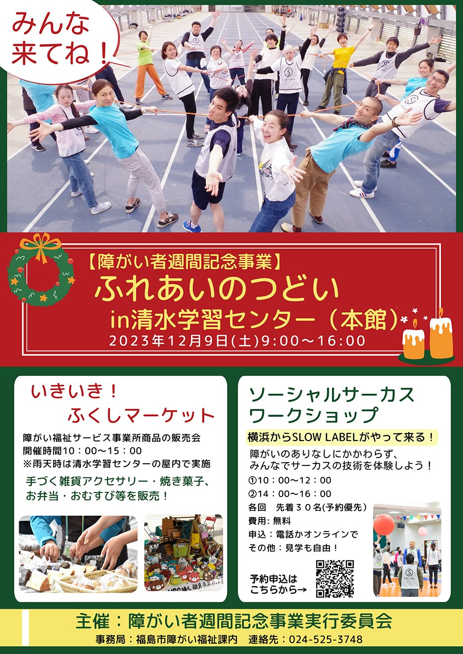 | お問い合わせ | 主催 障がい者週間記念事業実行委員会 清水学習センター 960-8252 福島県福島市御山松川原5−1 024-557-7400 |