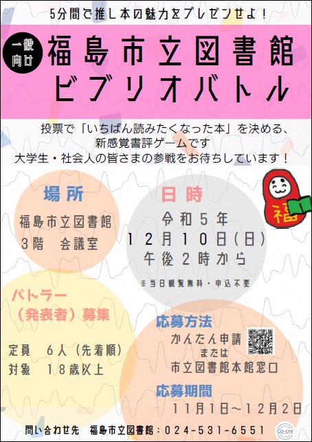 | お問い合わせ | 教育委員会事務局 図書館 管理係 福島市松木町1-1 電話番号:024-531-6551 ファクス:024-531-5507 |