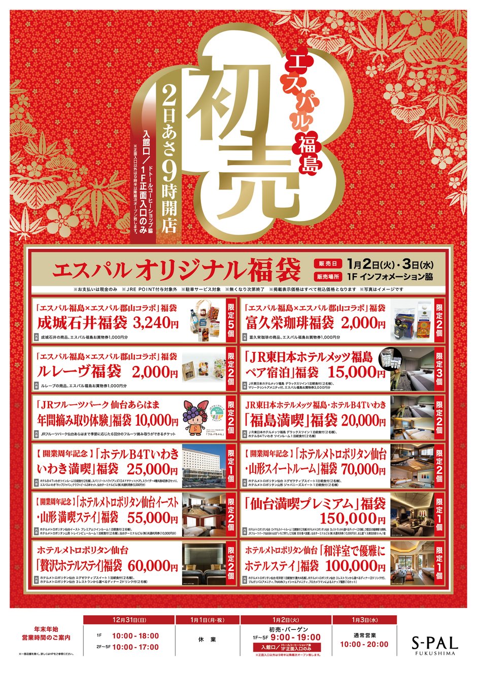 普段、エスパル福島では購入できない「エスパル郡山とコラボした」福袋や「JR東日本ホテルメッツ福島ペア宿泊」福袋など計12種類のオリジナル福袋を販売いたします。