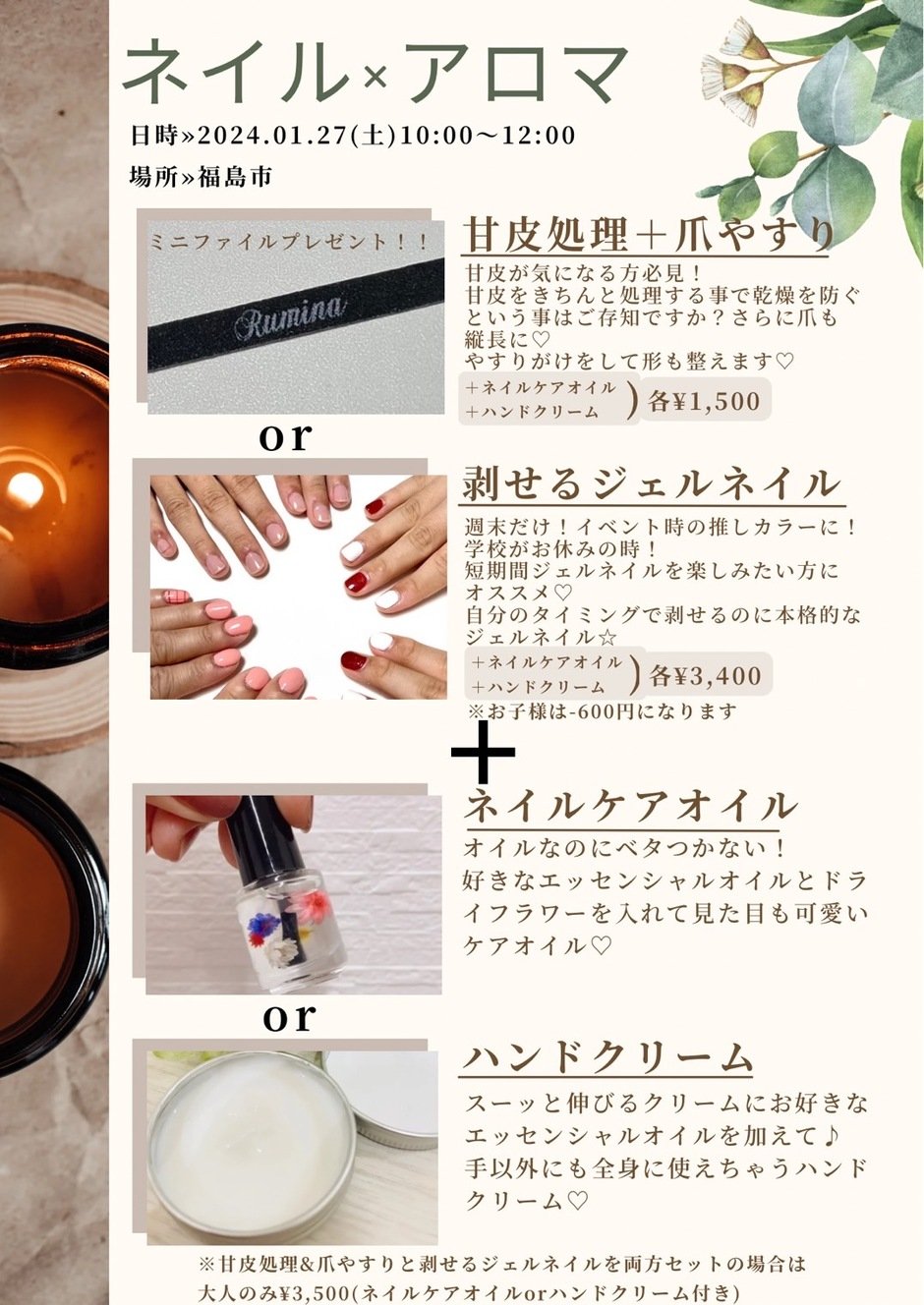 | 場所 | 福島市内 ご予約いただいた方には詳細住所お送りいたします。 |