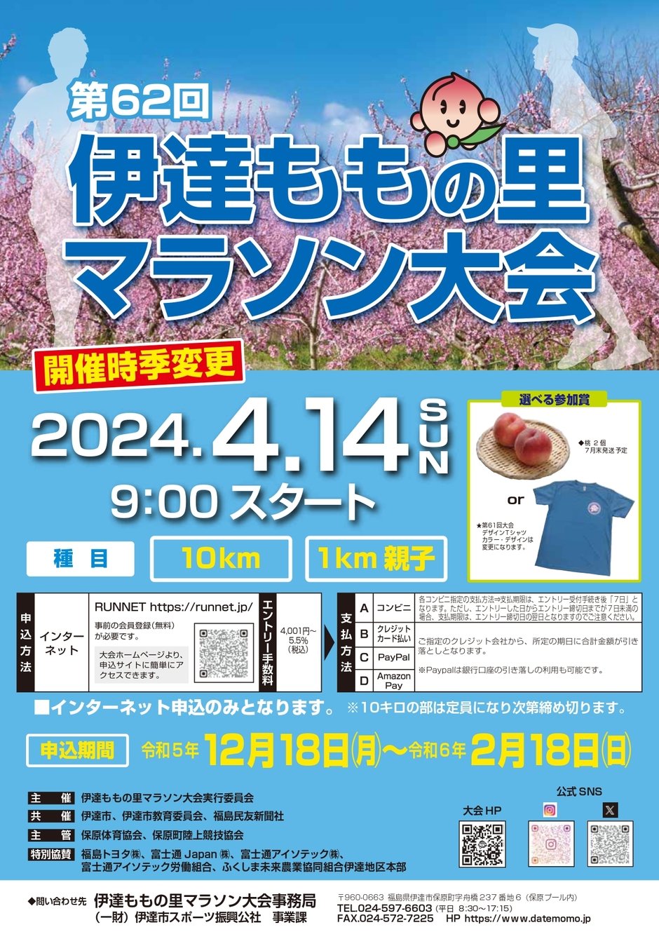| お問い合わせ | 【 お問い合わせ 】 伊達ももの里マラソン大会事務局 (一財)伊達市スポーツ振興公社 事業課 TEL:024-597-6603(平日 8:30~17:15) FAX:024-572-7225 |