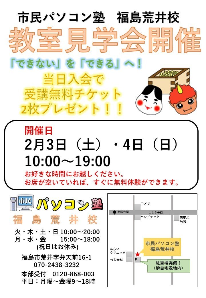 | お問い合わせ | 市民パソコン塾 福島荒井校 ☎070-2438-3232 |