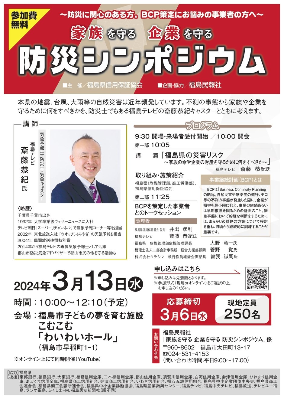 | お問い合わせ | 主催:福島県信用保証協会 お問い合わせ先: 福島民報社「家族を守る 企業を守る 防災シンポジウム」係 TEL:024-531-4153 (問い合わせ時間:平日9:00~17:00) |