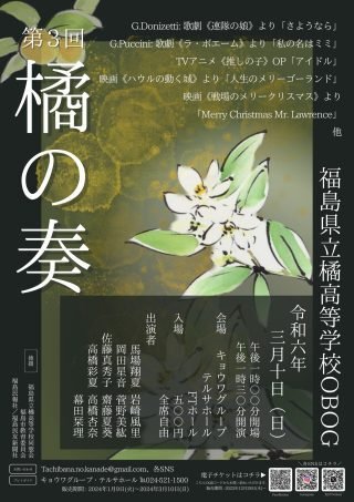 | お問い合わせ | 主催:福島県立橘高等学校OBOGによる演奏会 コンサート橘の奏事務局 問い合せ: URL:Tachibana.no.kanade@gmail.com |