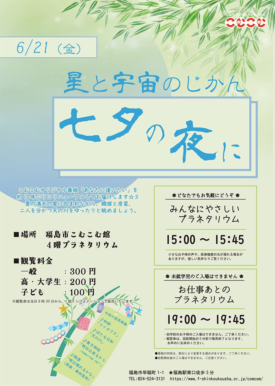 | お問い合わせ | 福島市子どもの夢を育む施設 こむこむ 〒960-8044 福島県福島市早稲町1−1 024-524-3131 |