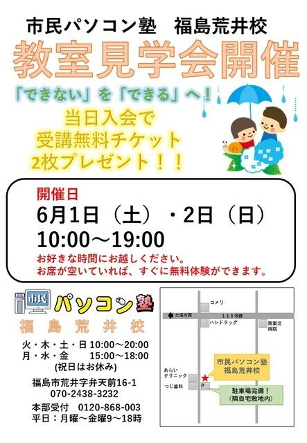 | お問い合わせ | お問い合わせ先 市民パソコン塾 福島荒井校 TEL 070-2438-3232 |