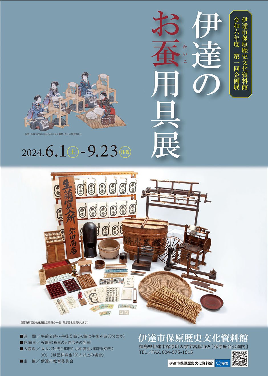 平成31年3月、伊達の蚕種製造及び養蚕・製糸関連用具1,344点が重要有形民俗文化財の指定を受けました。日本の近代化に大きく貢献した蚕糸業の中でも重要な存在であった伊達地方を長く支えてきた用具の数々です。今回の展示では、指定用具の一部を展示公開し、用具を通して見えてくる伊達の糸業の歴史を広く皆さんに知っていただき、伊達市の歴史と文化に誇りを持ってもらうための企画展です。