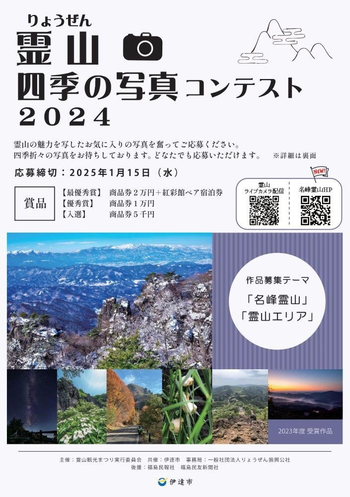 | お問い合わせ | お問い合わせ 霊山四季の写真コンテスト事務局 960-0807 伊達市霊山町石田字宝司沢9-1 024-589-2233 |