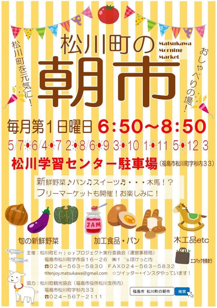 | お問い合わせ | お問い合わせ先 松川町Enjoyプロジェクト実行委員会事務局(㈱f’sぽけっと内) 024-563-5830 |