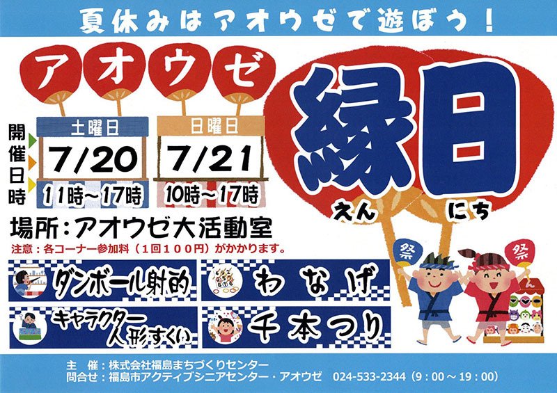 | お問い合わせ | アクティブシニアセンター・アオウゼ 〒960-8051 福島市曽根田町1−18 MAXふくしま 024-533-2344 |