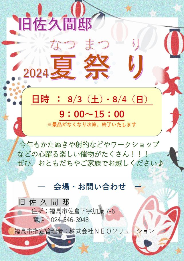 | お問い合わせ | 旧佐久間邸 960-2154 福島市佐倉下字加藤7-6 024-546-3948 |