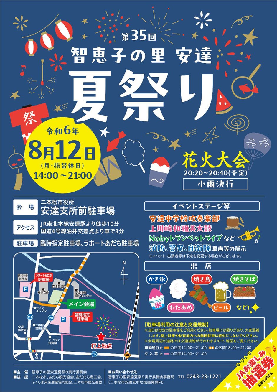 | お問い合わせ | お問い合わせ 智恵子の里安達夏祭り実行委員会 TEL:0243-23-1221 |