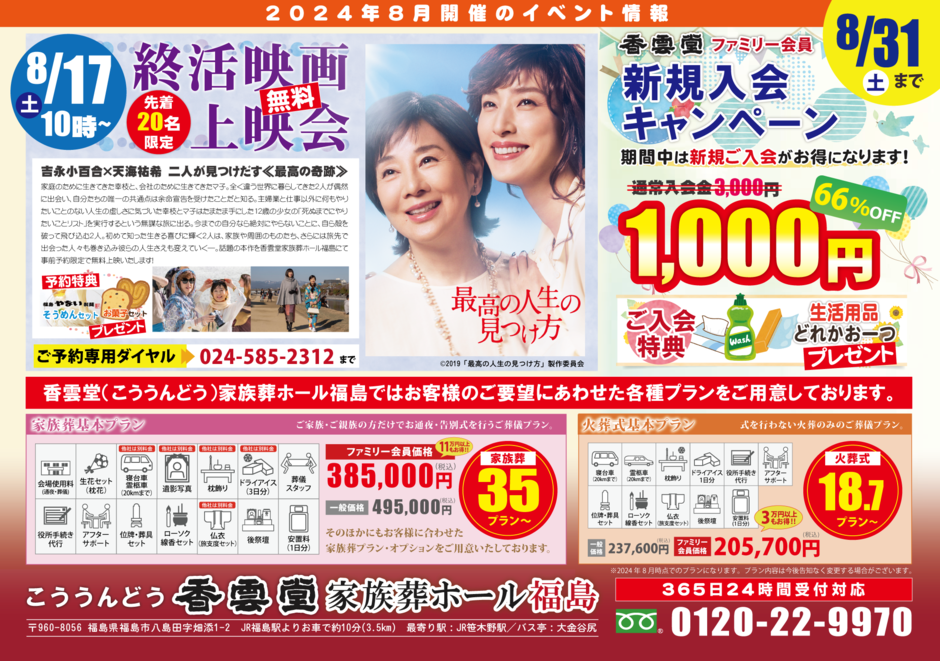総合葬祭 香雲堂(こううんどう)ではこの度「予約限定・終活映画無料上映会」を開催いたします。