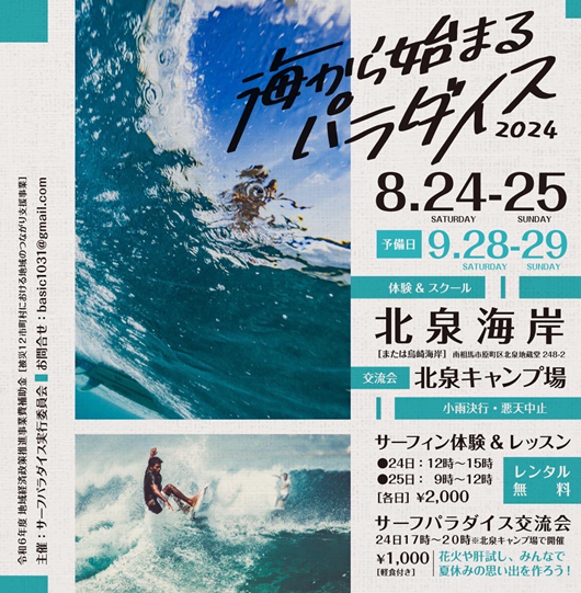 | 参加費 | ■サーフィン体験&レッスン¥2,000(レンタル料込み) ■交流会 ¥1,000(軽食付き) |