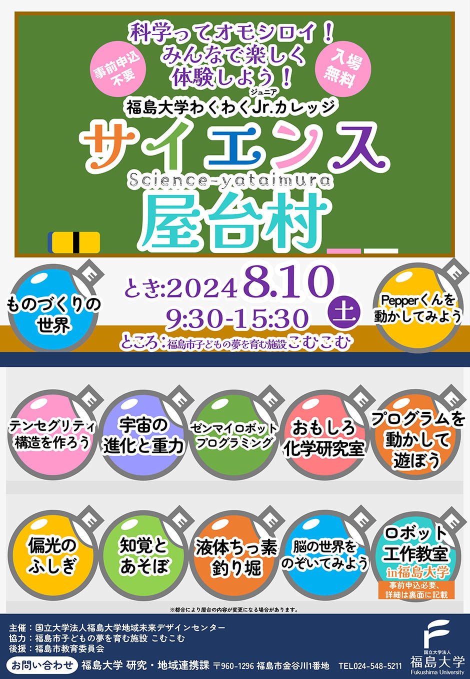 | お問い合わせ | 福島市子どもの夢を育む施設 こむこむ 〒960-8044 福島県福島市早稲町1−1 024-524-3131 |