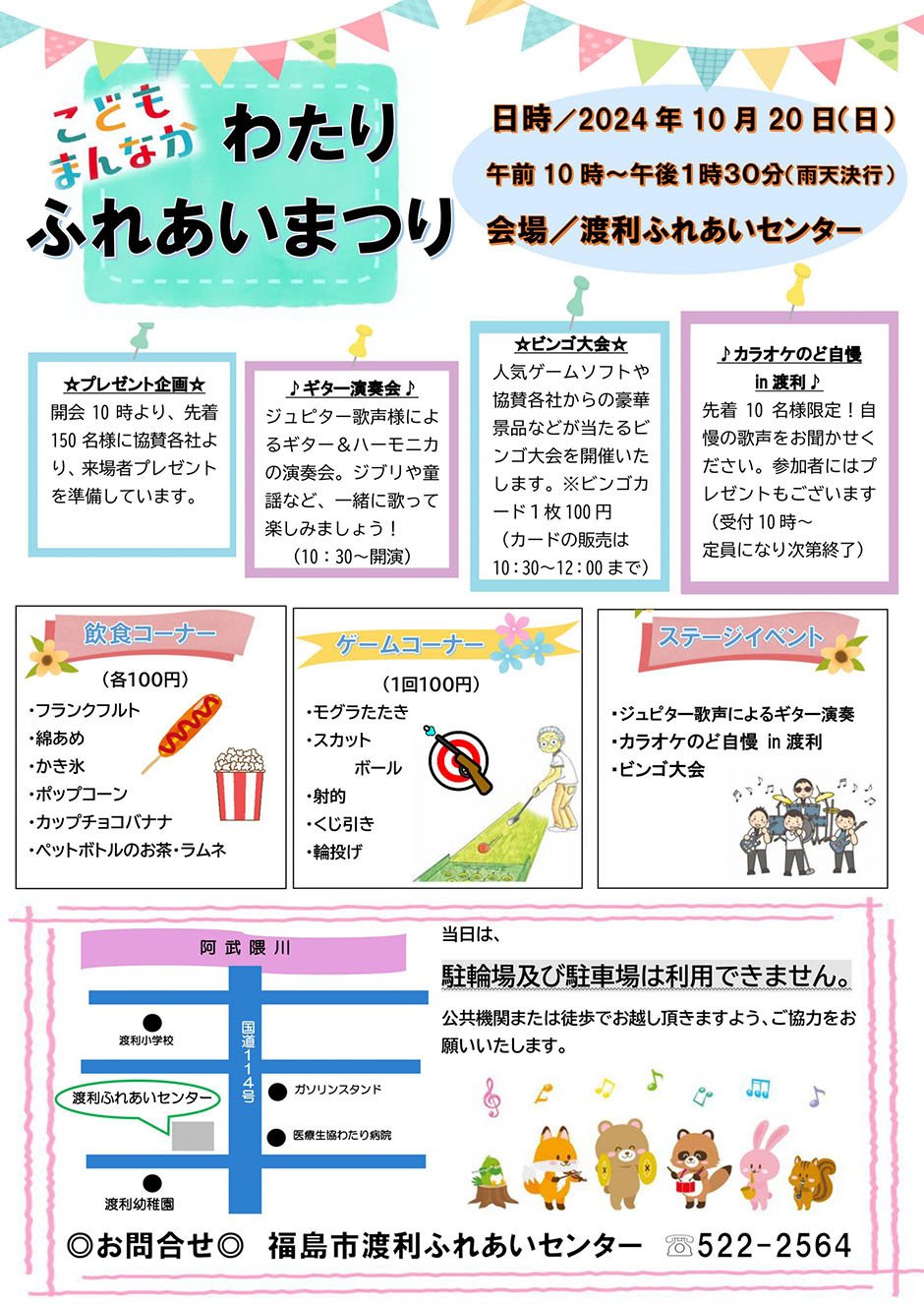 | お問い合わせ | 福島市わたりふれあいセンター 960-8141 福島県福島市渡利番匠町43 024-522-2564 【主催】 社会福祉法人福島福祉施設協会 福島市渡利児童センター、 福島市渡利ふれあいセンター |