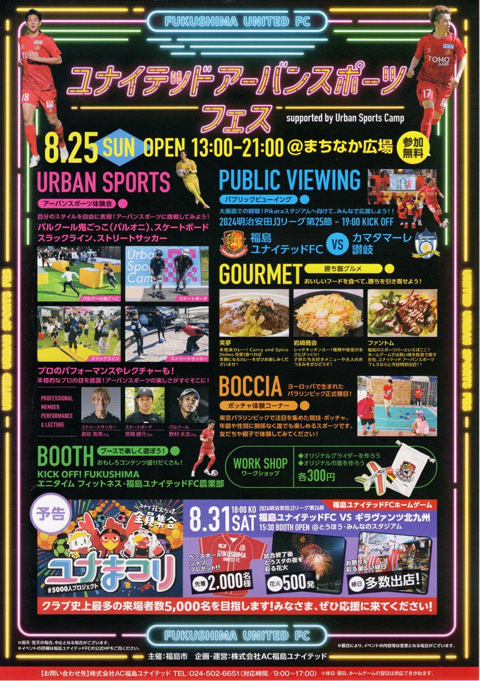 | お問い合わせ | 主催:福島市スポーツ振興課(主管:株式会社AC福島ユナイテッド) 問い合せ:024-573-8203(株式会社AC福島ユナイテッド) |