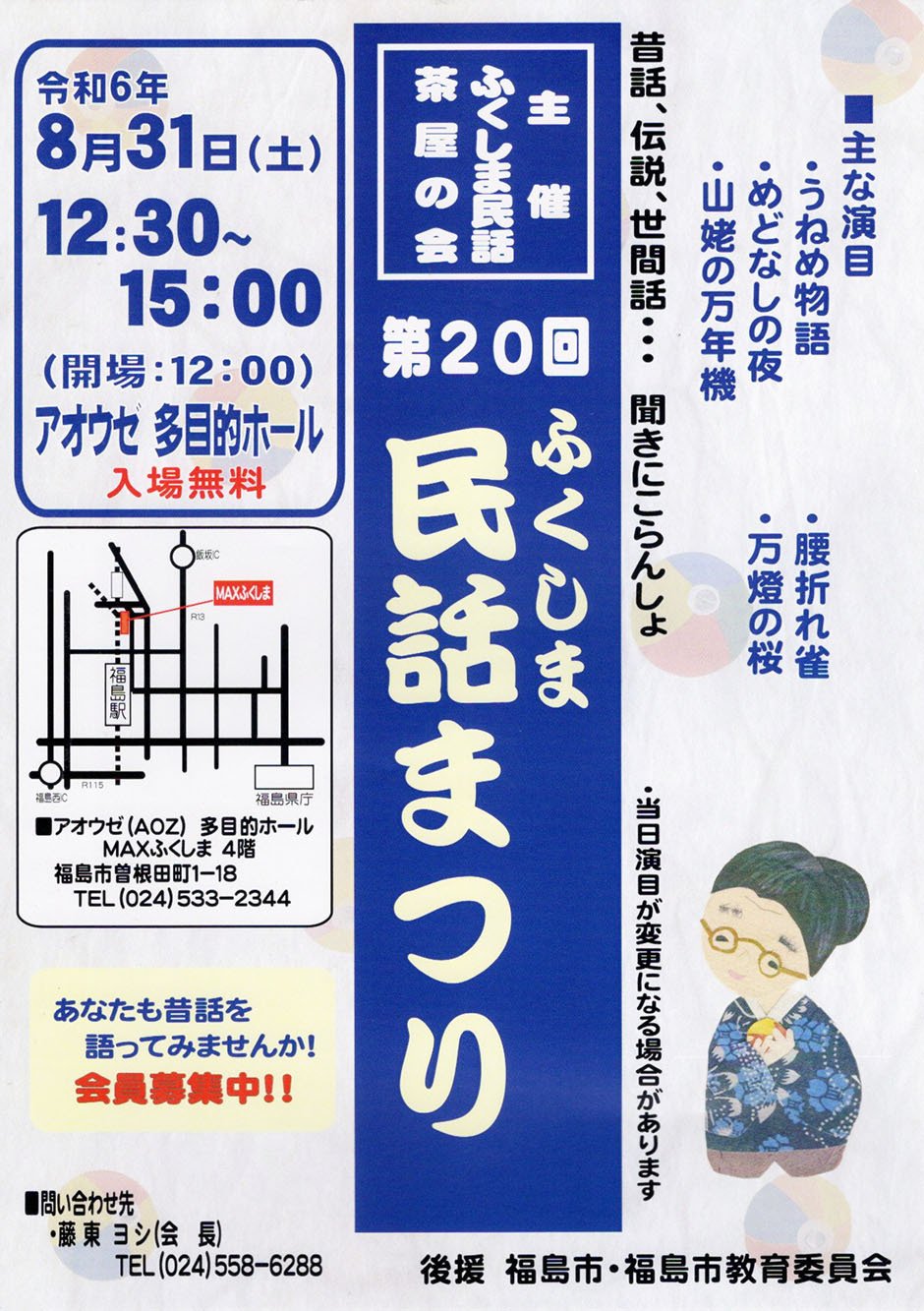 | お問い合わせ | お問い合わせ先 ・藤東ヨシ(会長) (024)558-6288 ・高橋富子(事務局長) (024)558-4663 |