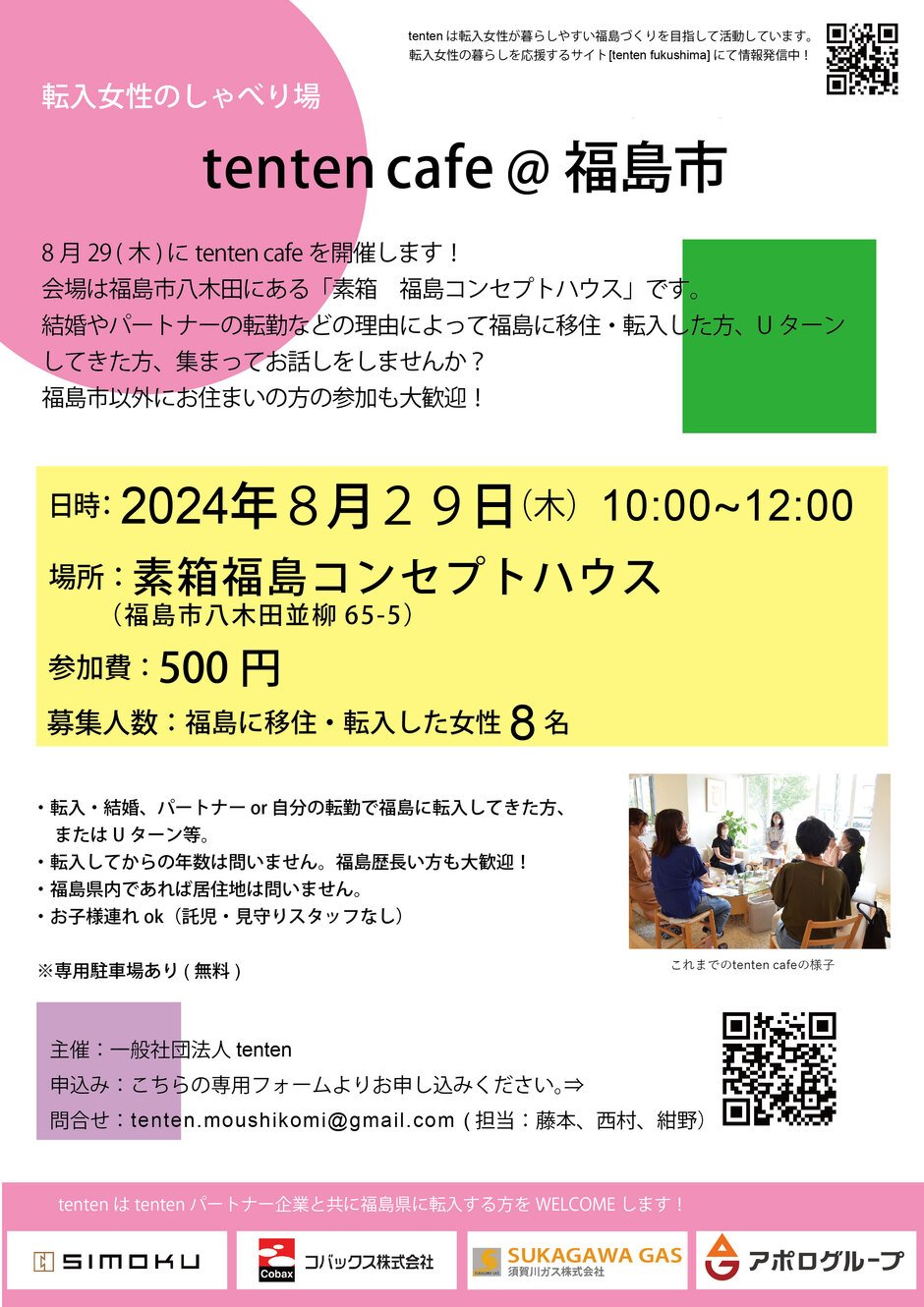 | お問い合わせ | 【問合せ】 tenten.moushikomi@gmail.com (担当:藤本、西村、紺野)まで。 「8.29 tenten cafe@福島市」と件名に入れていただき、本文にお名前、ご連絡先、お問合せ内容を明記ください。 |