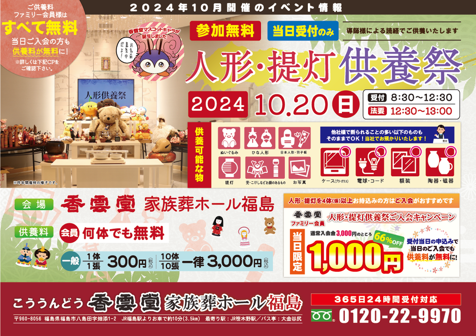 ※受付日(10/20(日)8時30分~12時30分)に香雲堂家族葬ホール福島まで供養品をお持ち込みください。