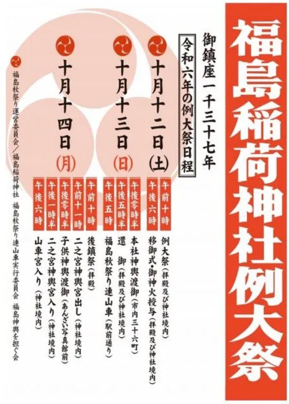 | お問い合わせ | 問合せ 福島市明るい祭礼等推進委員会(事務局:福島市にぎわい商業課 ) TEL024-525-3720 |