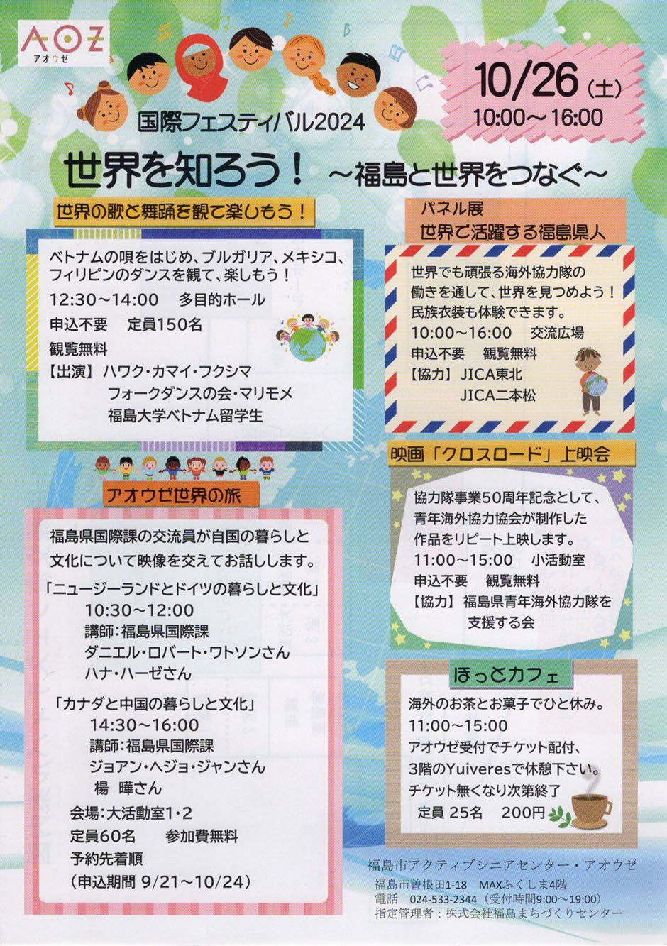 | お問い合わせ | アクティブシニアセンター・アオウゼ 〒960-8051 福島市曽根田町1−18 MAXふくしま 024-533-2344 |