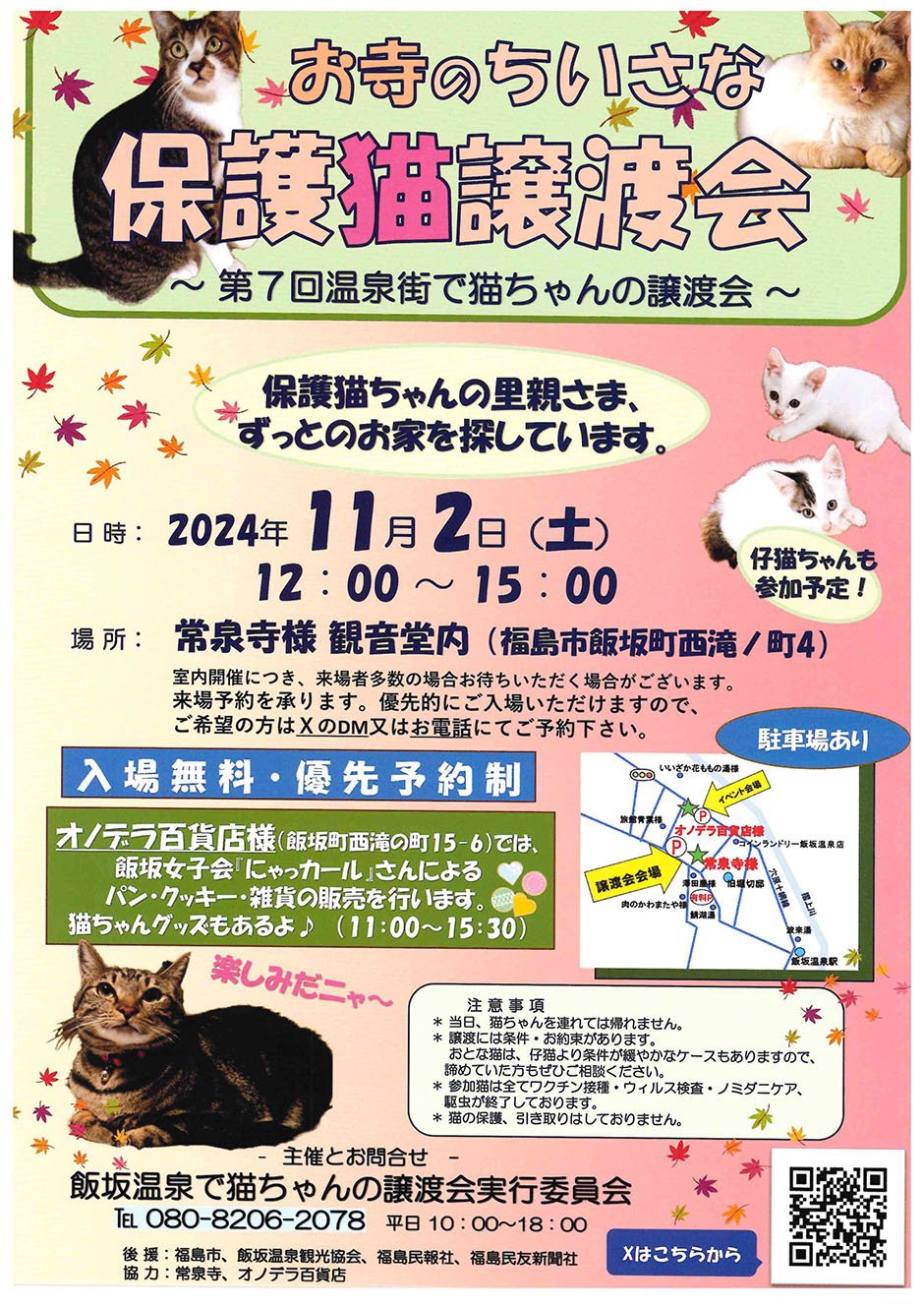 | お問い合わせ | ■主催・お問合せ 飯坂温泉で猫ちゃんの譲渡会実行委員会 TEL 080-8206-2078 平日10:00~18:00 |