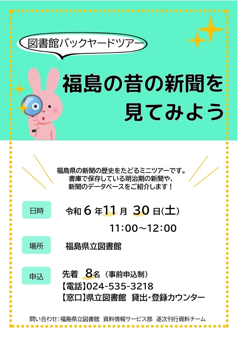 | お問い合わせ | 主催:福島県立図書館 資料情報サービス部 逐次刊行資料チーム TEL:024-535-3218 |