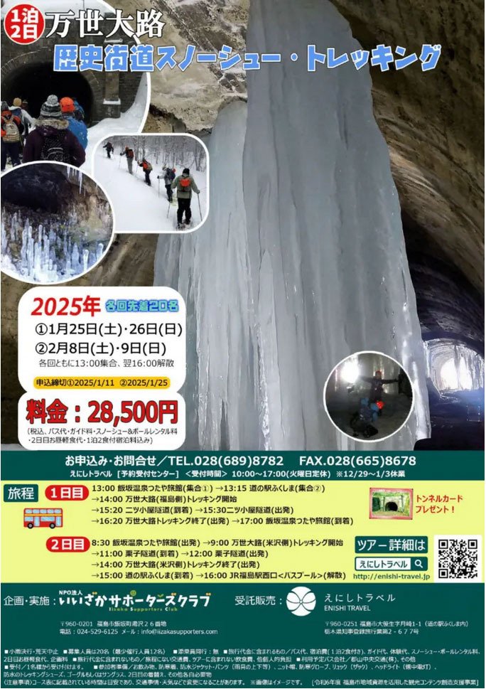 福島市と米沢市を結ぶ旧万世大路(ばんせいたいろ)の 2 ヶ所の廃トンネルを目指す、1泊2日のスノーシュー・トレッキングツアーです。