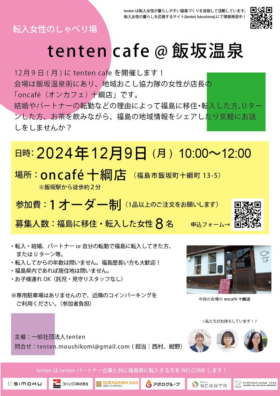 | お問い合わせ | 一般社団法人tenten tenten.moushikomi@gmail.com (担当:藤本、西村、紺野)まで。 「12.9 tenten cafe@飯坂温泉」と件名に入れていただき、本文にお名前、ご連絡先、お問合せ内容を明記ください。 |