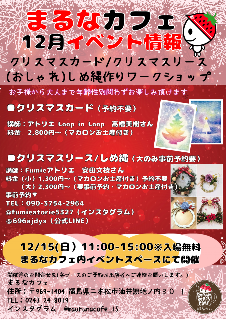 | お問い合わせ | 主催:まるなカフェ 住所:〒969-1404 福島県二本松市油井無地ノ内30−1 TEL:0243−24−8019 インスタグラム:https://www.instagram.com/marunacafe_15/ 公式LINE https://page.line.me/?accountId=771wbrqw |