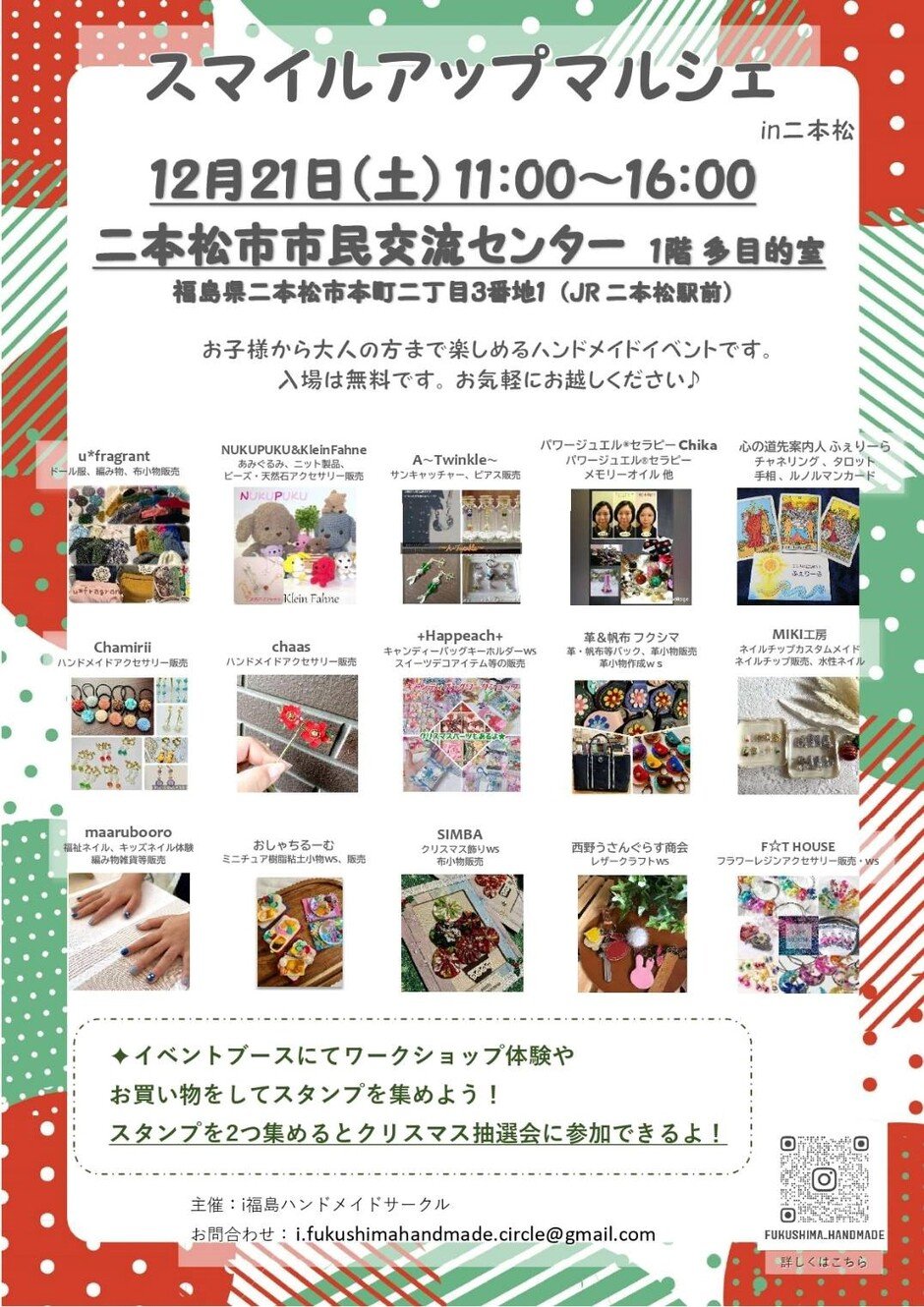 | お問い合わせ | i.fukushimahandmade.circle@gmail.com お問合せ/090-6224-2225(i福島ハンドメイドサークル 佐藤) |