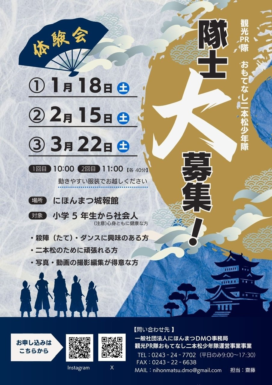 | お問い合わせ | 一般社団法人にほんまつDMO事務局 TEL:0243-24-7702(平日のみ 9:00〜17:30) FAX:0243-22-6638 Eメール:Nihonmatsu.dmo@gmail.com 担当:齋藤 |