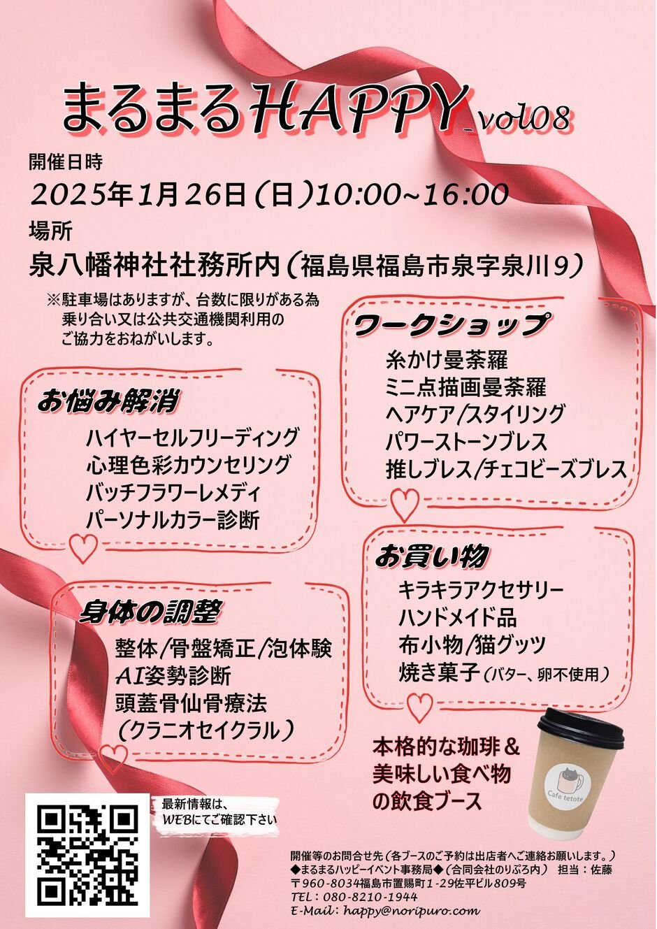 | お問い合わせ | ◆まるまるハッピーイベント事務局◆ 〒960-8034福島市置賜町1-29佐平ビル809号 TEL:080-8210-1944 E-Mail:happy@noripuro.com HP:https://noripuro.com (合同会社のりぷろ内) 担当:佐藤  |