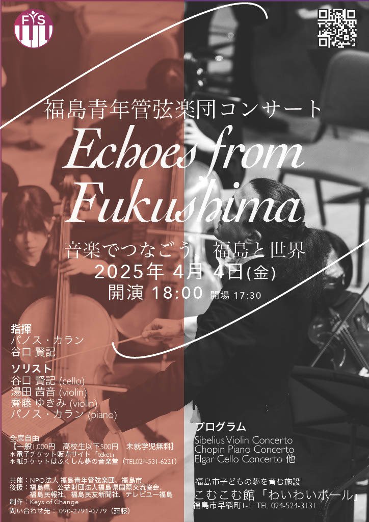 | お問い合わせ | NPO法人 福島青年管弦楽団 E-mail:hiroki@keysofchange.org Tel:090-2791-0779(齋藤弘樹) |