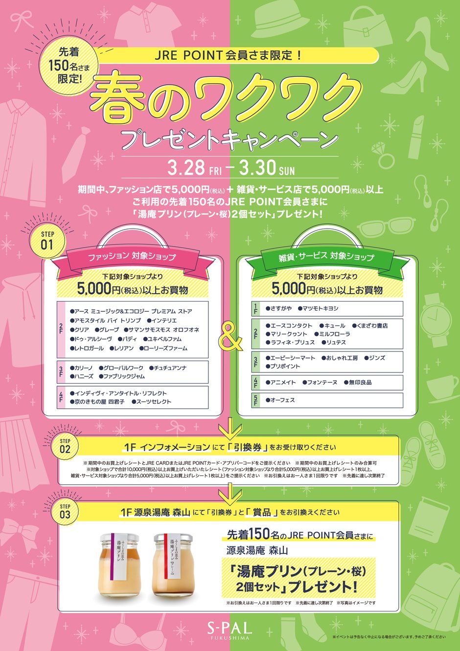 ■内容 期間中、ファッション店で5,000円(税込)以上+雑貨・サービス店で5,000円(税込)以上ご利用の先着150名のJRE POINT会員さまに「湯庵プリン(プレーン・桜)2個セット」プレゼント!
