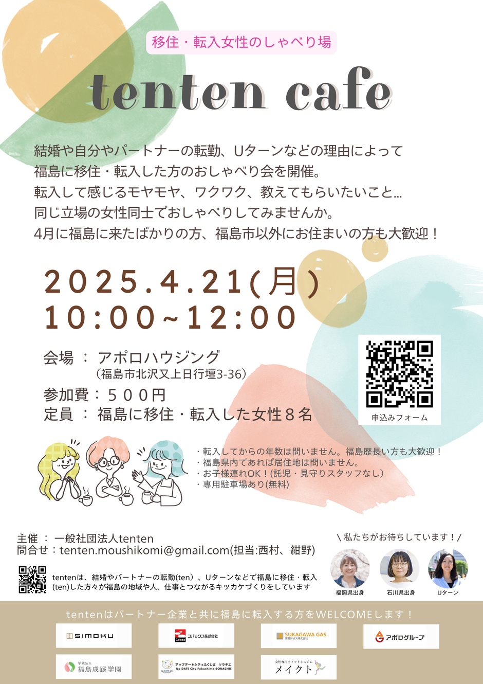 | お問い合わせ | 一般社団法人tenten tenten.moushikomi@gmail.com (担当:藤本、西村、紺野)まで。 「4.21tenten cafe@福島市」と件名に入れていただき、本文にお名前、ご連絡先、お問合せ内容を明記ください。 |