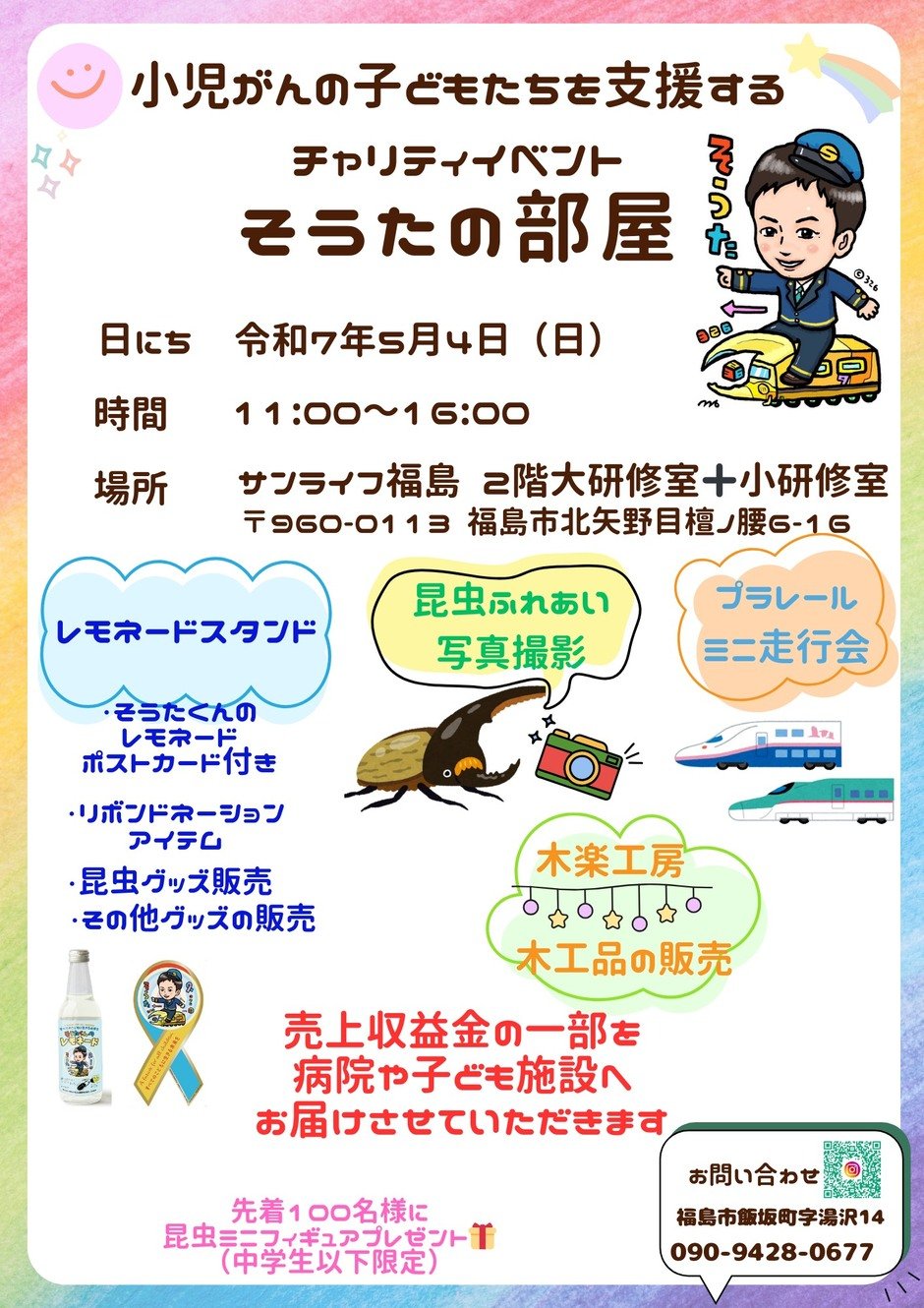 | お問い合わせ | 小児がんの子供達を支援する会 そうたの部屋 souta.no.heya.fukushima@gmail.com |