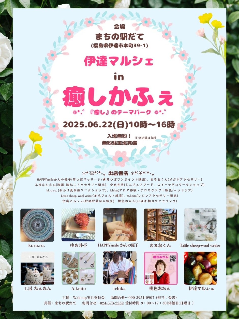| お問い合わせ | 主催:Wakeup実行委員会 共催:まちの駅だて お問合せ・090-2951-0907(担当:金沢) お問合せ・024-573-2232受付時間9:00~17:30(休館日:日曜日) |